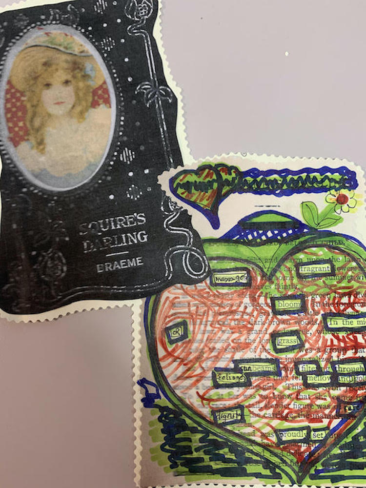 I started with a page from a very old book. There is no copyright date in the book but I am guessing that the book is probably from around the turn of the 19th Century by the way it is bound and the color imprint on the cover. I made a copy of the page and started my drawing. You can barely see the words I boxed because the book is so old but you can read the poem I created using the boxed words below.